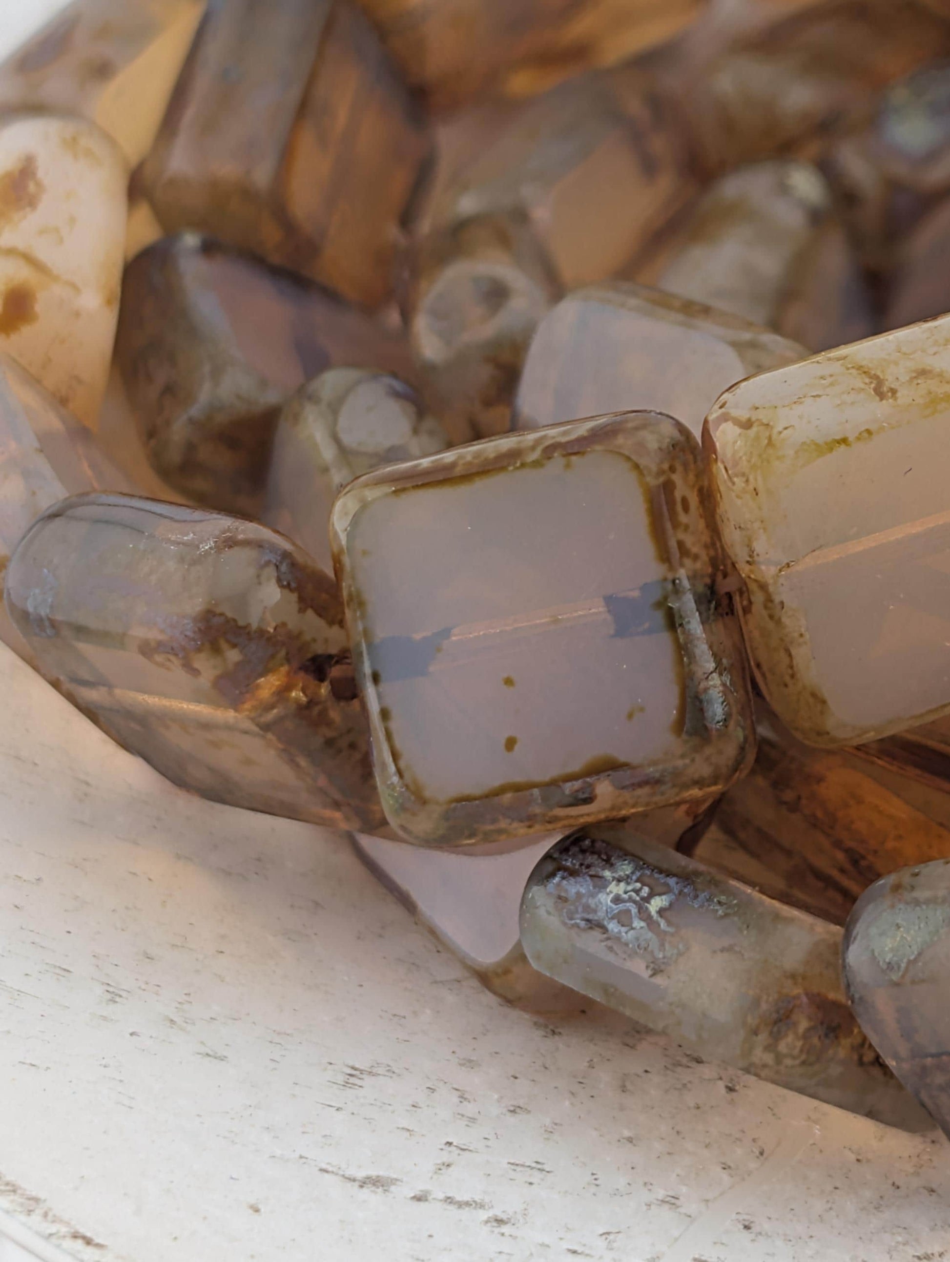 10mm Czech Glass Table Cut Square Milky Picasso Beads | Boho Jewelry Making Supply | Tile-Shaped Craft Beads | Khakhi Swirl | 15 pcs