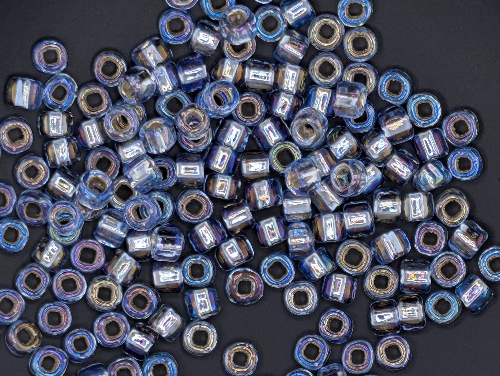 - Frosted seed beads featuring a delicate silver lining and translucent rainbow effect
