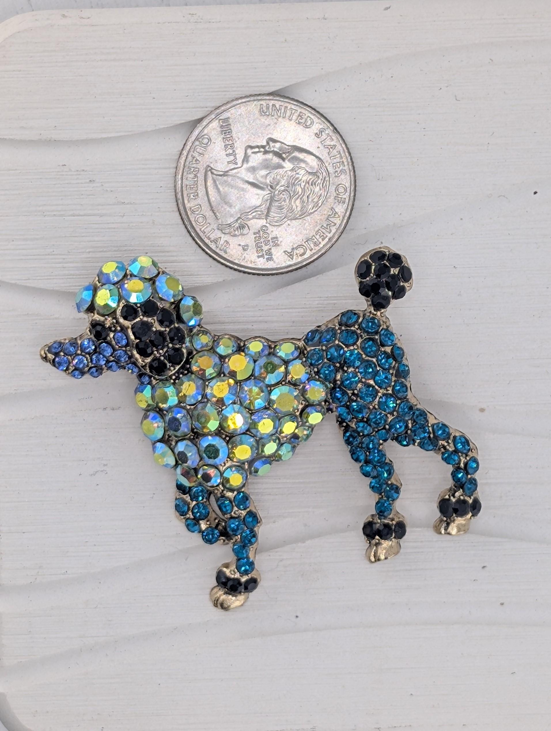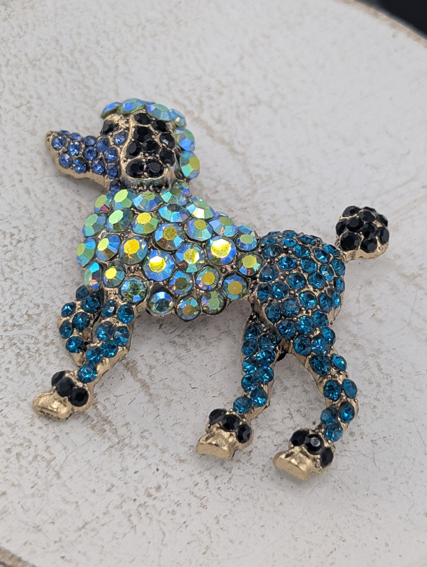 Gold Plated Blue and Green Rhinestone Poodle Dog Brooch