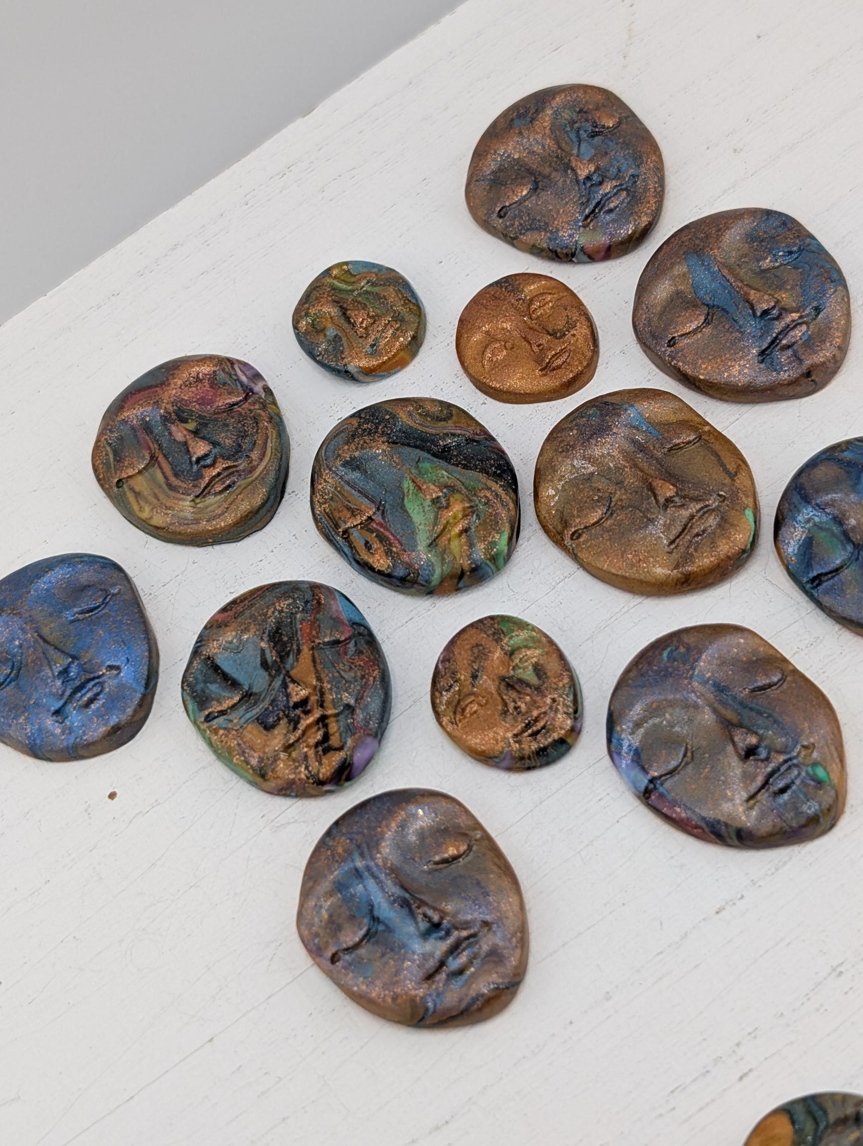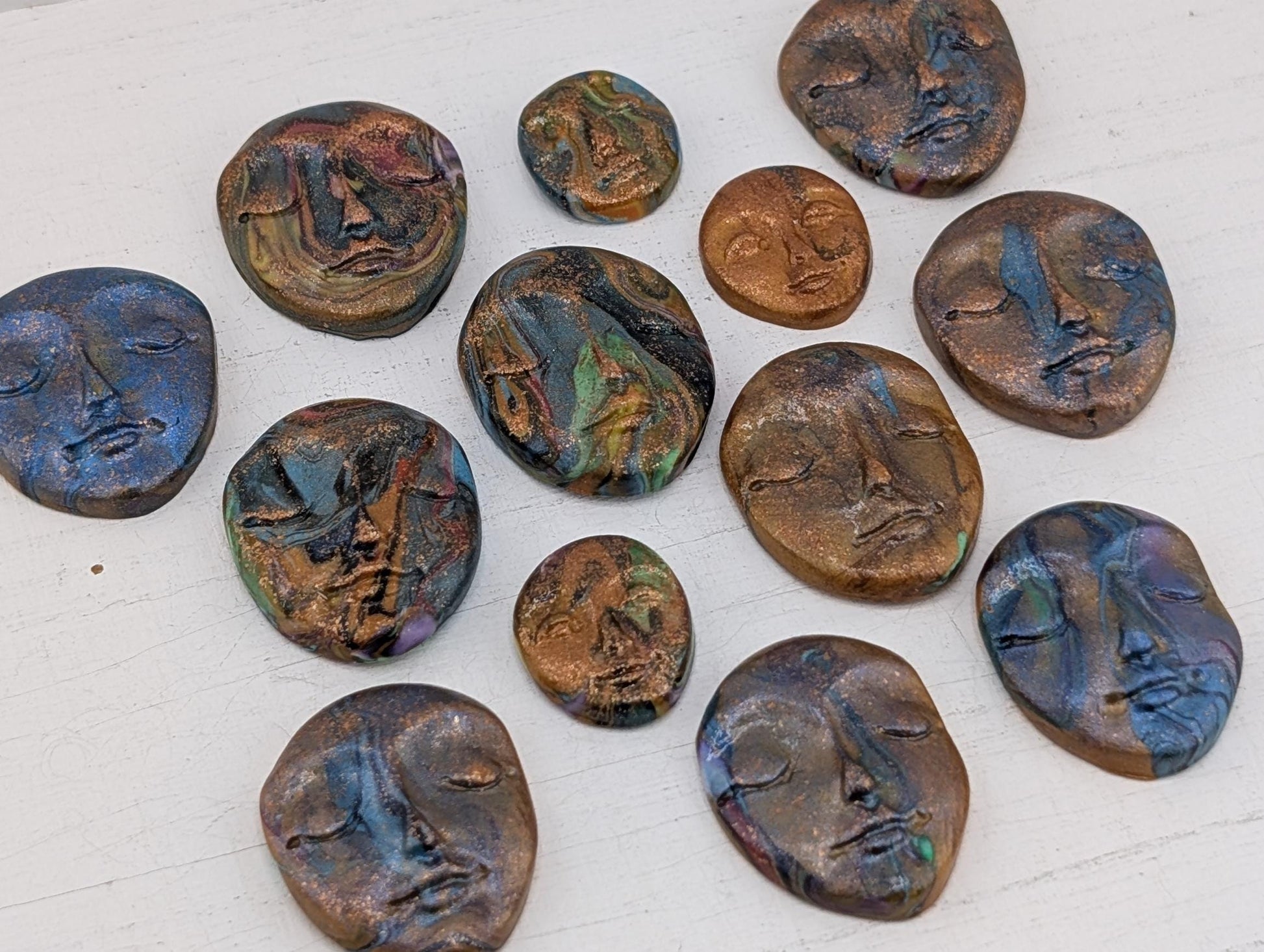 - Set of 12 handcrafted polymer clay faces, each with a unique expression