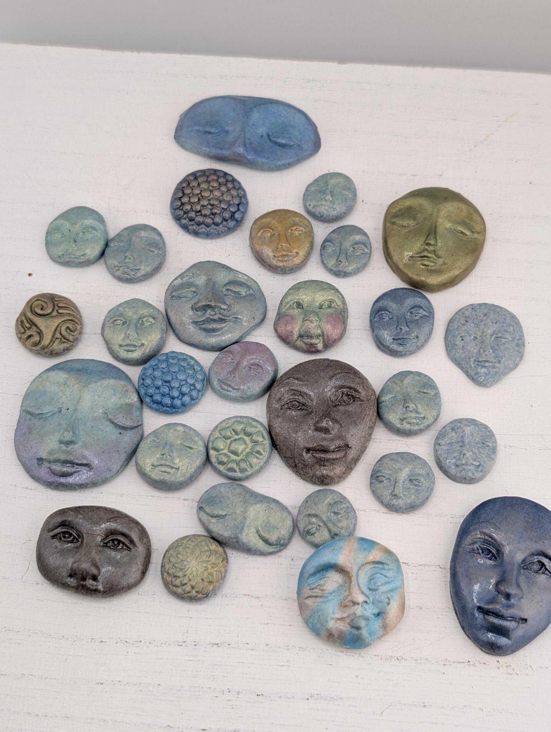 - A total of 39 handcrafted polymer clay faces in vibrant shades of blue, green, and purple