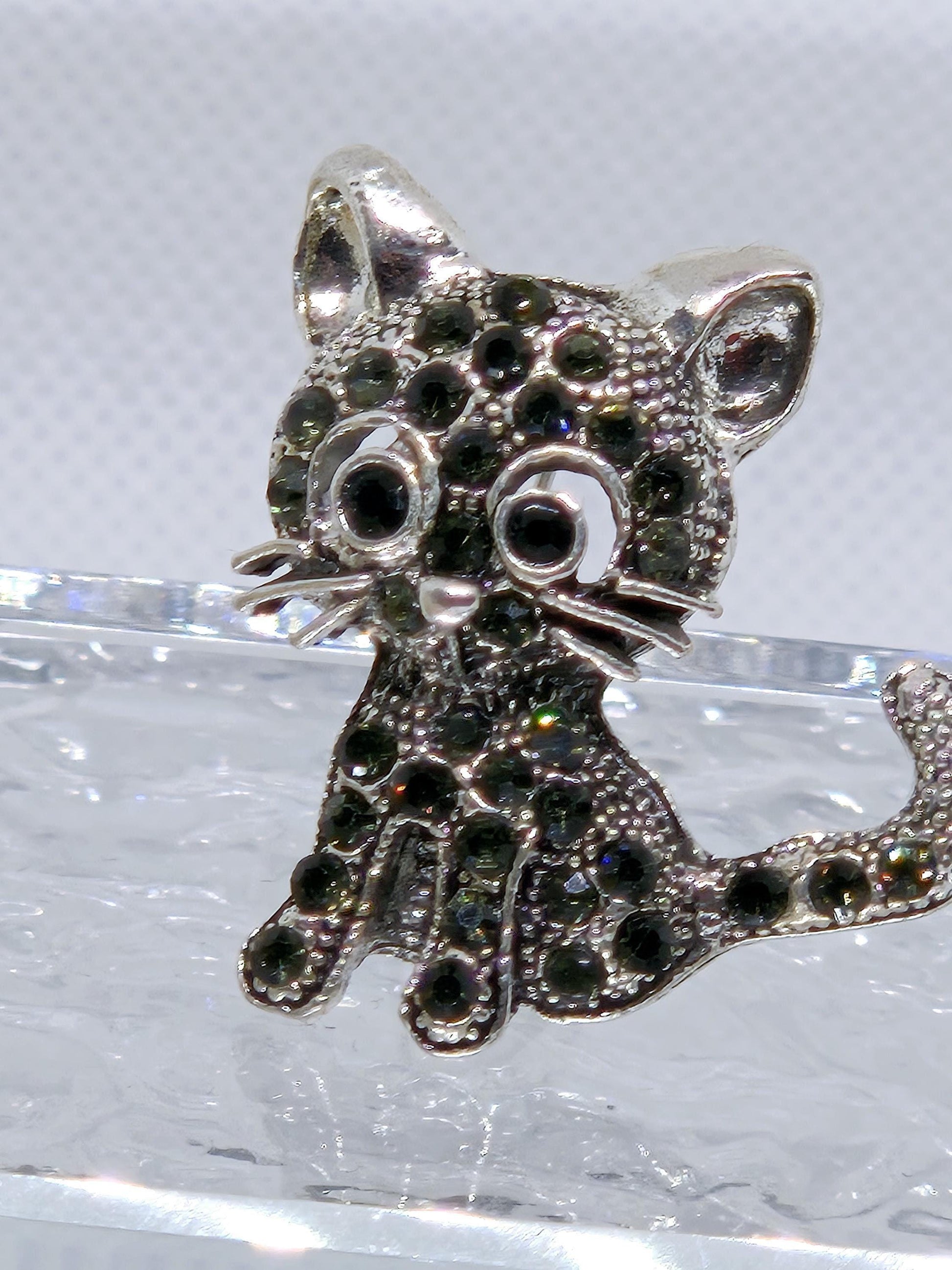 Silver Plated Cat : Black Rhinestone Kitty Jewelry Brooch